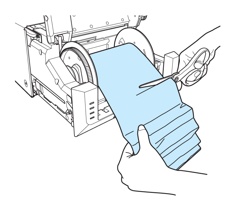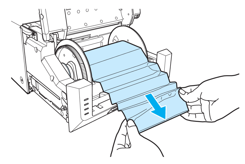 Entfernen Sie den Papierstau. Wickeln Sie das Papier auf die Papierspule, indem Sie die Spule in entgegengesetzter Richtung zum Papierpfad drehen. Entnehmen Sie dann das Papier aus dem Drucker, indem Sie das Papier nach vorn und weg vom Drucker ziehen.